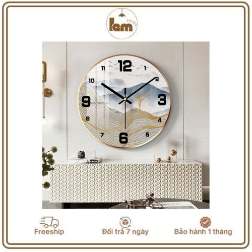 Mặt đồng hồ in hình núi non và chim trời, tông xanh – vàng nhẹ nhàng, tạo cảm giác thư giãn và trang nhã.